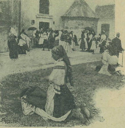 Ženské pohlaví nosí místo obyčejných šorců, hustě vrapovanýeh, na velké svátky bílé »f ěrto chy«, jež rovněž od zadu se přikládají. Na Velecku jsou šafránově žluté! Na Kyjovsku nosí se červené krátké kanafasky, nebo o slavnostech zelené a černé sukně s modrým pruhem dole. Sukně ty, ale jen
