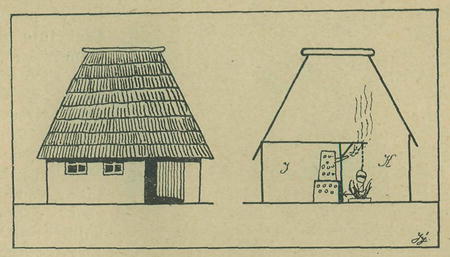 11. Horuoněmecký důra v Bosně. K kuchyň (kuěa, rabinja) s ohništěm, J jizba (soba) se stropem a kamny.