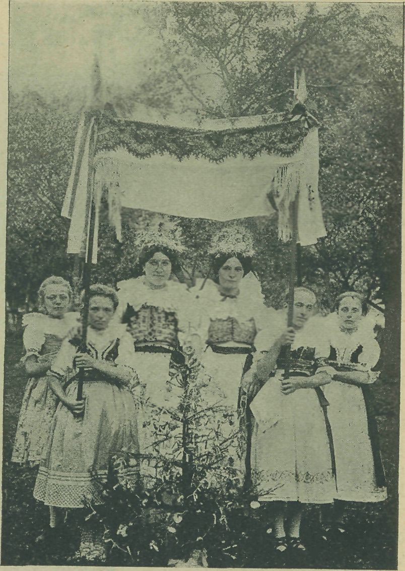 Školačky: nesou na hůlkách baldachýn — ověnčený, starý pestrý lipský šátek — pod ním král s králkou: obě pod bílú, na hlavách korunky z perel, zrcadélek atd., opentlené na hlavě a kolem pasu, za pasem vyšívané šátečky, před nimi májíček, ověnčený po-