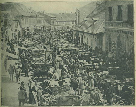 O jarmarku v Nymburce v ulici Rolnické. Z díla: F. Kulhánek, Dějiny Nymburka, 1911.