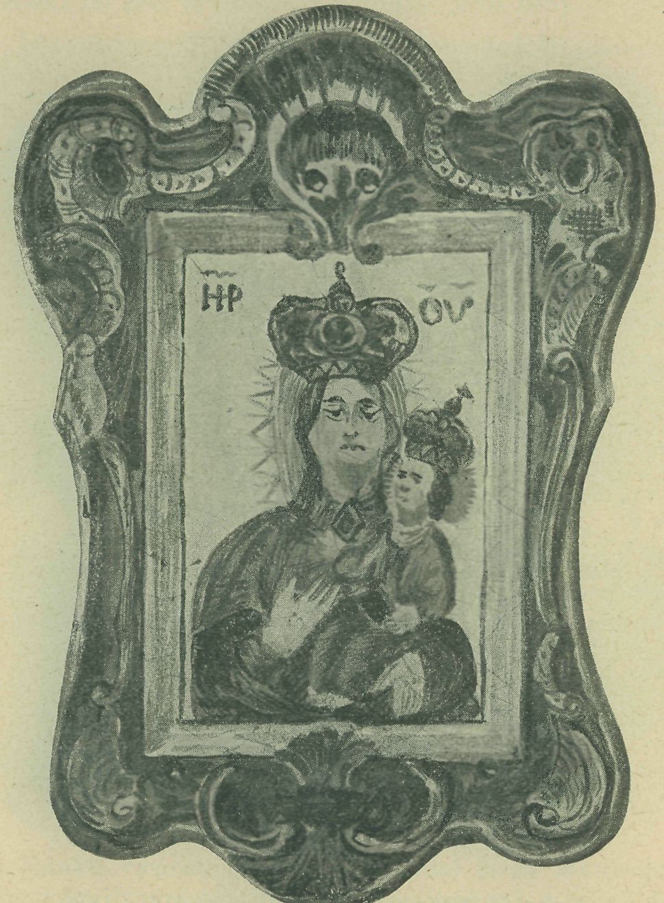 Panny Marie s Ježíškem v barokovém rámci (zhotovený dle známé černé Madonny) v barvách karmínové, žluté, zelené a černě stínované; vedle koruny na hlavě P. Marie umístěna jsou obvyklá na obraze tom písmena (viz obraz č. 6).