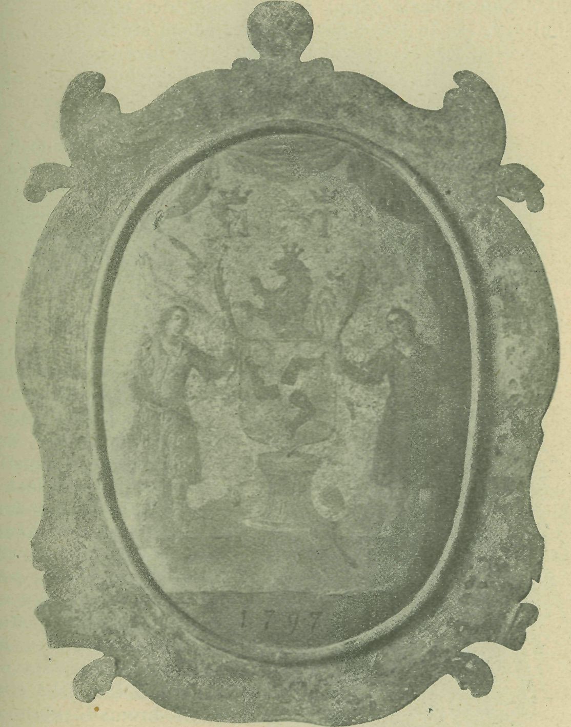 2. Sv. Krišpín a Krišpinian na malovaném štítu pohřebním z r. 1797.