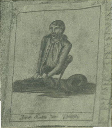 v osobě nastati nemohla, připojena ku podivné této knihovní vložce i věrná, v barvách provedená podobizna žebrákova. Jest to snad jediný případ v Čechách, kde ke knihovní vložce připojena podobizna vkladatelova. Připojené vyobrazení jest dle fotografie, pořízené od p. Jos. Nováka ve Zbirově.
