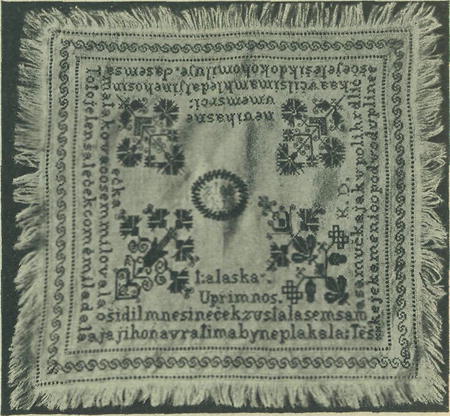 Šáteček vyšívala Viktora Šafářová z Velké u Uh. Hradiště. Dán byl, jak ukazuje nápis uprostřed věnečku — »z la-ski«. V rozích jest pěkná výzdoba ve vzoru lidových prvků ornamentálních. Přednášející u-pozornil, že děvuška slovácká nemá nálady svě-tobolné, když ji postihla nevěra milencova... Osiřela chuděrka sama samučká jako v poli hrdlička, ale nehrozí přemírou vášnivé