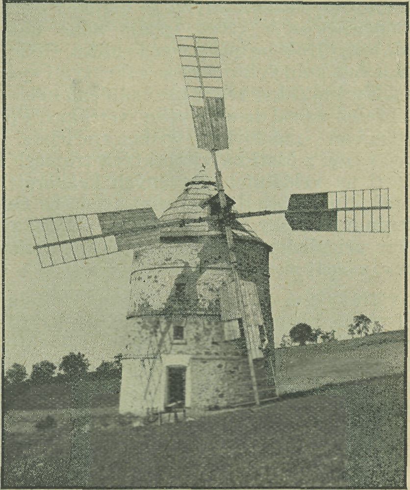 z tvrdého staviva, jak je tomu na př. na Svatém Kopečku u Olomouce. Mají-li se natočit proti větru křídla, točí se u dřevěného mlýna celá budova, u zděného pouze vrch, kuželová střecha s křídly. Na obrázku břestského dřevěného mlýna je vidět zařízení na otáčení celé budovy. Do »větřáku« je zapuštěno »oje«,