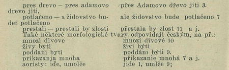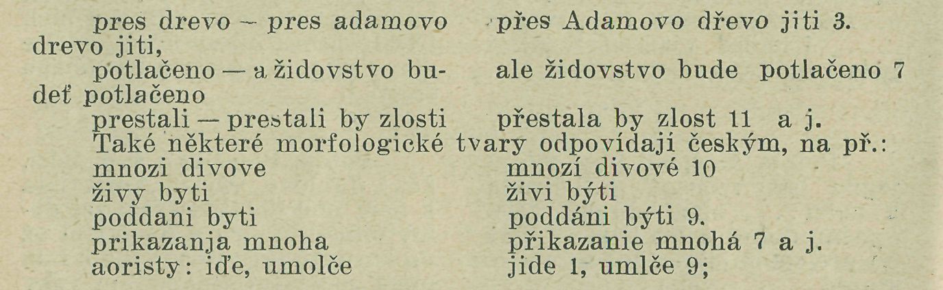 zvláště imperfekty, o nichž Karskij píše: »imperfekty s -ę- svoj-stvenny i drevněrusskomu jazyku, no bělorusskomu jiarečijii v 16. věkě, koněčno, byly neizvěstny« (str. 20—21) — překladatel je přímo opsal ze své předlohy, jako opsal i inf. sluti (čes. sluti) při slyti na druhém místě. Forma 1 os. šing. »vidim«, která podle mínění Karského vznikla snad vlivem srbštiny (v. Skazanije, str. 25), jest opis českého »vidím«: že jednu hvězdu vidím na nebi; rusky: iže zvězdu vidim na nebe. Tyto a ještě jiné doklady, jichž zde neuvádím, omezují vliv cirkevnoslovanský až na to, že překladatel obvyklým způsobem užíval církevněslovan-