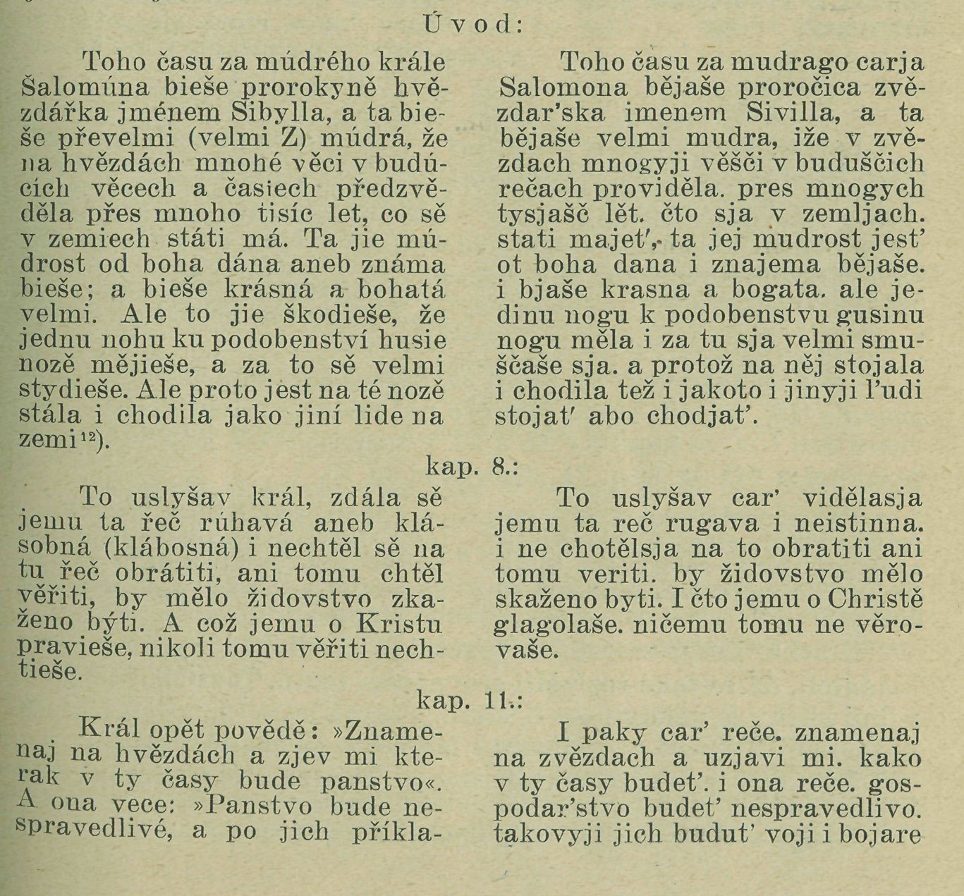 To by byly n,ejvětší odchylky ruského překladu od českého textu, všecko ostatní přeloženo jest skoro doslovně. Konečně uvádím několik kapitol s paralelnými texty, českým a ruským, které zřejmě ukazují, že ruský překladatel měl v rukou předlohu ienom a jenom českou.