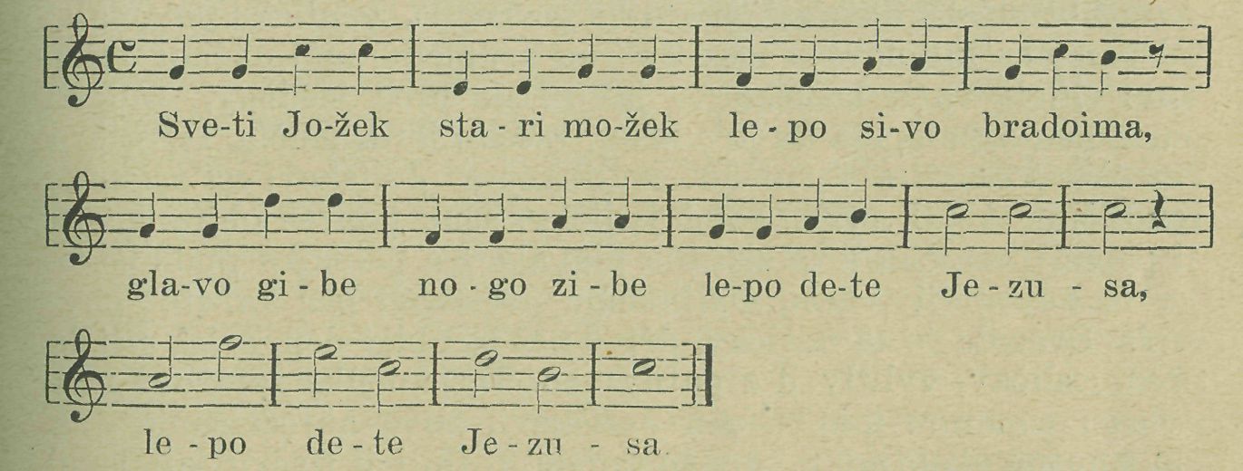 usazené. Zpíval ji, jako ige zpívá u nás píseň »Doikola okolo stola«. Připíjelo se při zpěvní vínem a na každou lichiou notovou čtvrtku