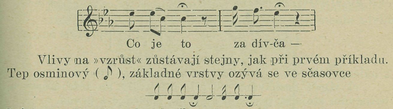 V dvojhlasném variantu z Rovného (le) je hudebnost větší. Průběh sčasovací je vniterný, má vytčená zřídla, dokud skladatel nenapodobuje. Tato zřídla — obzvláště reálné motivy — mohou býti si podobala; písně na břehu Moravy na břehu Odry, mají stejnou rytmiku.***) Snad1 jsou téže rytmiky i na břehu Gangu1?