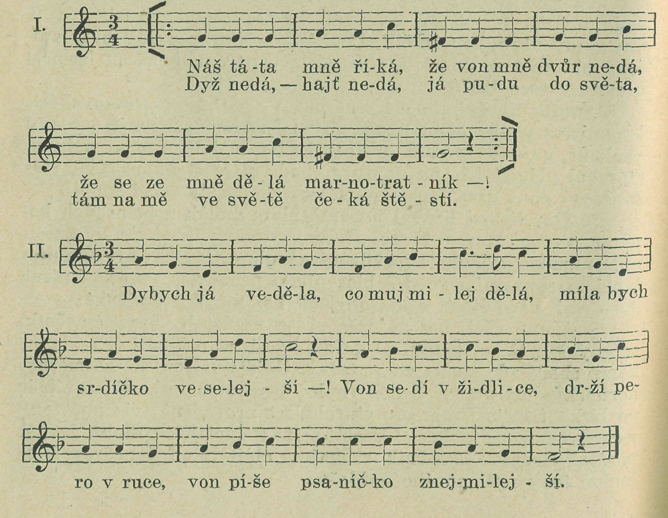 Pozn. red. V Českém Lidu XXVI. uveřejnil jsem vzpomínky a ukázky dopisů zvěčnělého J. Š. Baar a, Z korespondence zaslané vybírám dnes ukázky Baarovy sběratelské činnosti na poli národních písní iza doby, kdy v Pražském semináři předsedal kroužku horlivých sběratelů látky národopisné pro Český Lid. Viz uvedené vzpomínky v Č. L. XXVI. Teksty písní otiskoval v Českém Lidu, v prvních ročnících. Prosil jsem za nápěvy k textům. Poslal mi ukázku tuto, připomínaje, že o nápěvy chodských písní stará se mii s nemalou ochotou Josef Weber, učitel v Klenci: »Stoj zde tato ukázka z nich!«