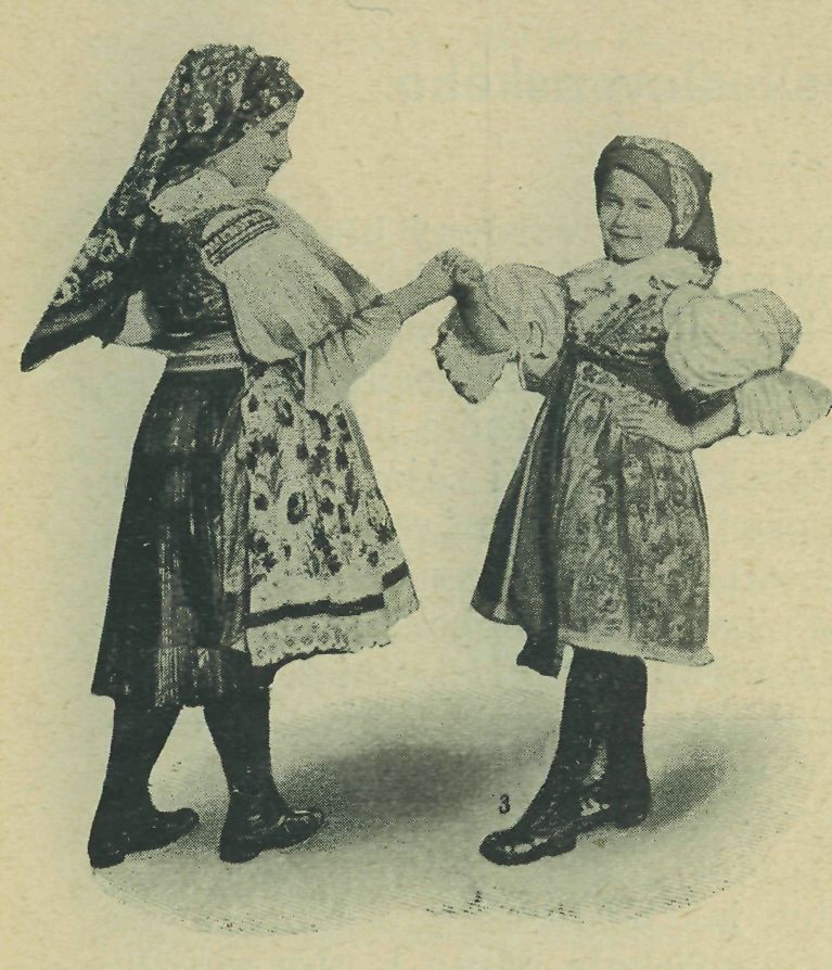 3. Veverička. Písnička: »Tancovala veverička s veveří, měly šišky za. kobližky k večeři. Tancovala veverička s veverkou, utíraly sobě očka zástěrkou!« Tanečnice obrátí se čelem k sobě. Pravé ruce si podají tak, že dlaněmi se dotýkají a prsty zaklíní; drží je ve výši ramenou. Levé ruce v bok. V prvních dvou taktech zatočí se čtyřmi kroky v pravo dokola půlkruhem (v každé do'bě krok), takže si vymění místa; vykročí levou nohou. Ve druhé době drahého taktu již stojí proti sobě čelem. Potom se sobě dvakráte pokloní tímto způsobem: V prvé době třetího taktu pravou nohu pokrčí, levou současně šoupnou v zad a špic-