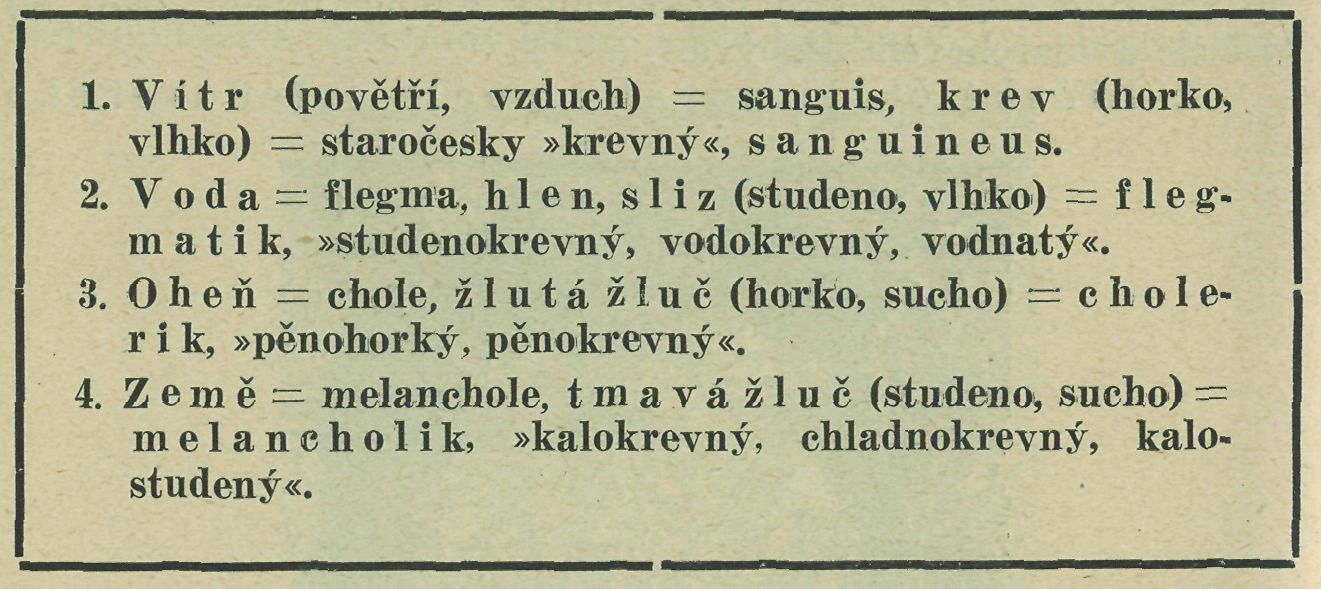 v těle: 1. krve, sanguis latinsky; 2. hlenu, slizu, latinsky fleigttia; 3. žluté žluči, řecky ©hole; 4. tmavé, černé žluči, melan ehiole), jest rozdíl v komplexí, povaze, letoře lidské. Když je člověk vlhký a horký, jest Sanguinikern. Člověk studený a vlhký jest flegmatik. Člověk suchý a horký jest choleru. Člověk studený a suchý melancholik- Tedy v přehledu: