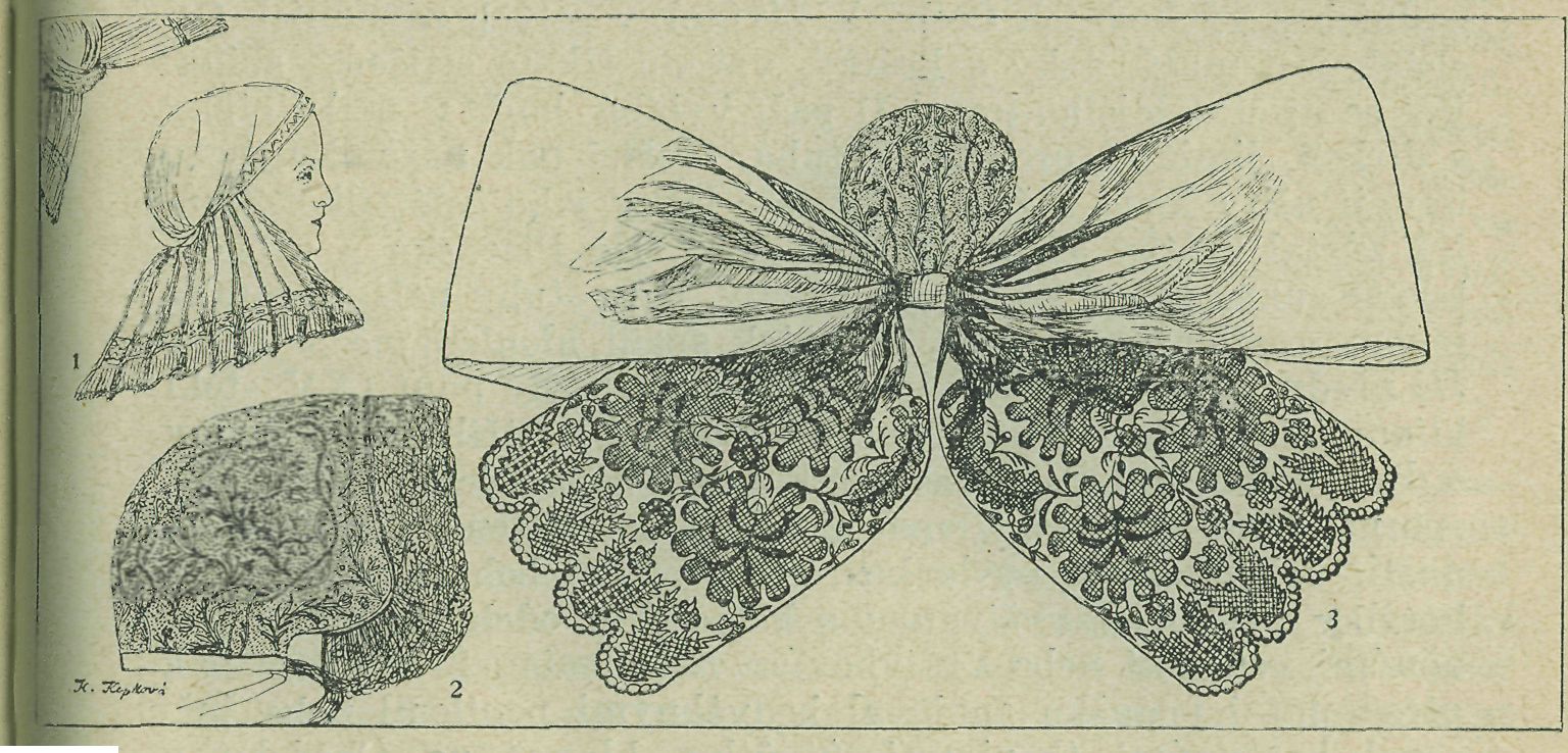 Obr. IV. Šatky.1. Loketsko. 2. Polovina uzlíčkového čepečku pro svobodnou. 3. Plzeňsko.