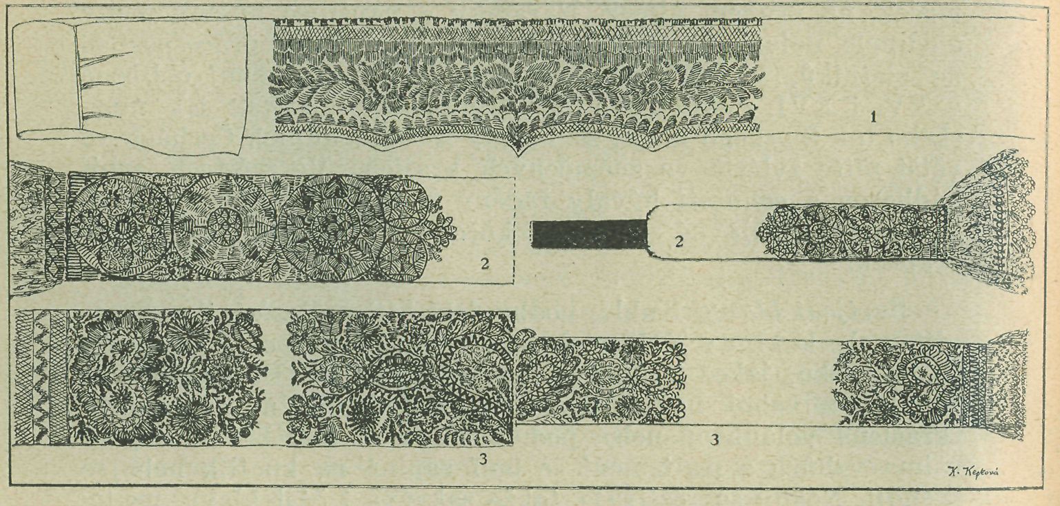 tkaniny průsvitavé, v řidších případech i tenkého plátna. V době románske pokládala se šatka lehce na témě hlavy, přidržována jsouc různými loubky neto spinadly, kterážto úprava se zachovala dodnes u krojů jihoslovanských. Šatky tyto byly rozšířeny po celé Evropě a zvláště mimo oblast slovanskou, zhotovovány bývaly z tak hebkého a vzdušného materiálu, že ani vlasů nezakrývaly. Proto jim také říkali »prohlídací«. Úprava tato byla tak sličná a tradiční, že téměř všichni malíři a rezbári pozdějších věků, až! na malé výjimky, zobrazovali Pannu Marii s podobnou šatkou na hlavě nebo s pláštěm stejně upraveným. Rouchy tyto v západních Cechách, do XVI. stol. »šlogíře« zvané, kterými si ženy hlavu zavíjely, zachovalý se u nás již v podobě pozměněné. V první polovině XIX. století se nosily ještě na Loketsku a celém bývalém širokém Chodsku přes čepce »koláče«, první pod jménem »plínka« nebo »plena«, skoro v původním svém tvaru, pod vlasy v uzel svazovaná. Je to pruh plátna,