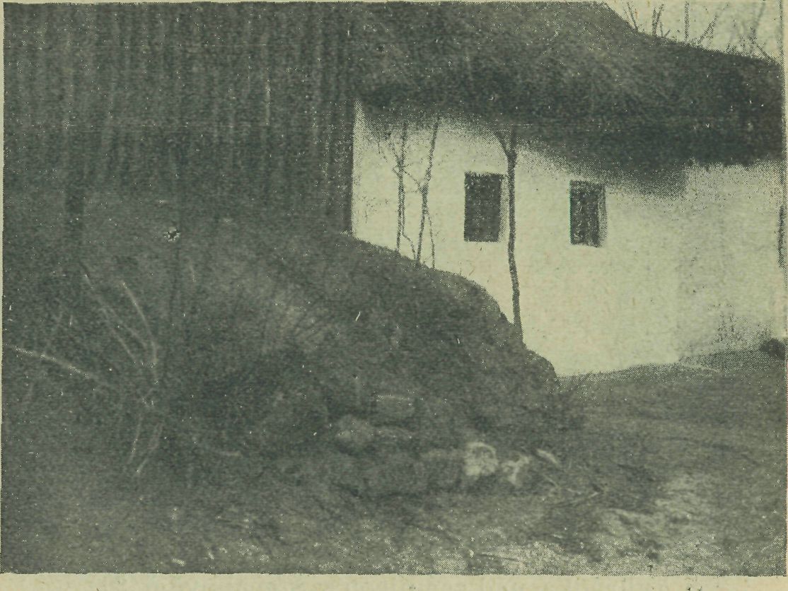 asi jednoho metra. (V zemnici č. 300 je ich sedem.) Sú to zhruba otesané trámy, strednej hrúbky a okolo spojené sú hradami, ktoré lud nazýva »potrevnice«. Každé dva protiľahlé stĺpy spojujú na vrchu »trámi« a na týchto pokladené sú pozdĺž desky, alebo tenké, neotesané drúčky. Táto drevená vložka z každej strany obklopená je zemou. Podlaha je tiež len ubitá hlina. K obytnej miestnosti pripojuje sa z ľavej strany komora, ktorej úprava je v hlavných rysech tá istá jako u izby, len vnú torné náradie chybuje.