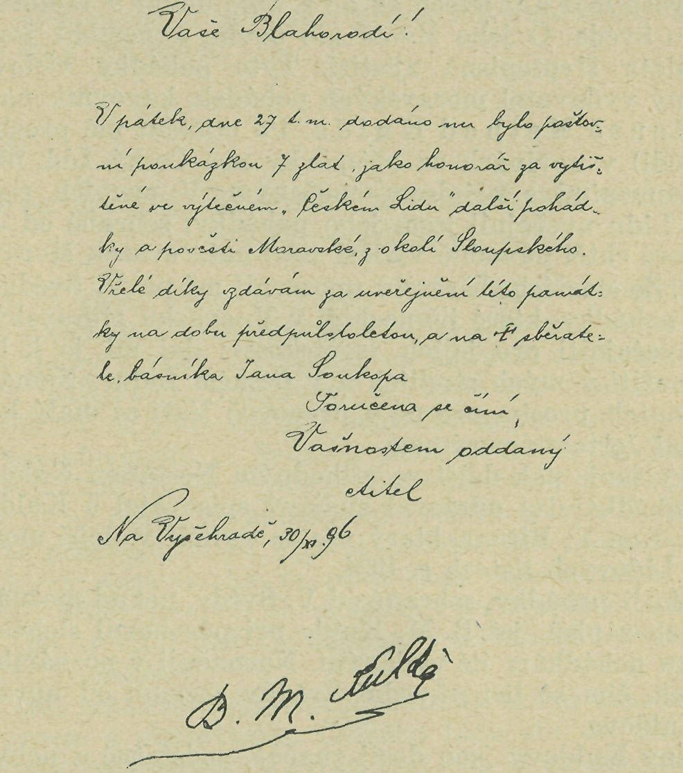 B. M. Kulda píše redaktoru Českého Lidu o Moravských pohádkách J. Soukopa dne 30. listopadu 1896.