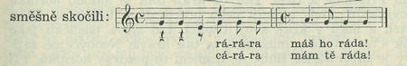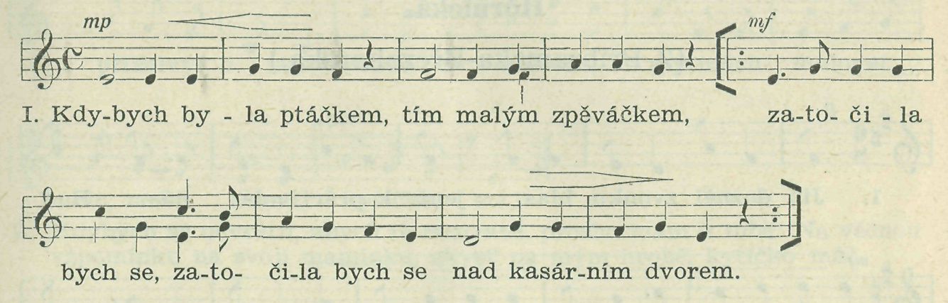 U nich ve vsi o muzice to muzikanti tak hráli prý —¦ s tím dodatkem. A velcí tak s nimi zpívali. Zjistil jsem, že tento přídavek zavinil jeden lidový kapelník. Napsal pro svoji kapelu tento »kousek« jako polku (trio); a jako ostatní lidoví skla-datelé-muzikanti, ani on nesnesl té pausy v ukončení (v repetici) . Musil tam něco přidat a přidal ten motivek dobře. Lidový člověk hned jak to uslyšel, musil si k tomu ovšem udělat slova. V písničce mluví dívka a naivně představuje si vojenský život.