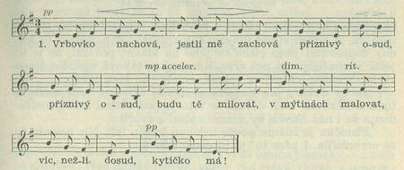 Písnička narodila se ve válce v r. 1918 na italské frontě u Humarie. Je to jediná písnička, kde za kolikaleté sběratelské práce zjistil jsem vznik.*) Bylo to před poslední ofensivou Italů. Od 88. pěš. pluku odjížděl jistý voják na dovolenou do Čech. Jeho přítel — náš skladatel, šel ho vyprovodit — s myšlenkami hroznými a těžkými. Vždyť se tam všeobecně říkalo: Tady je jistá smrt. Když se rozloučili, šel náš zpěvák sám a těžko mu bylo. Div nezaplakal. V dálce na pahrbku uviděl, jak se tam červená spousta vrbovky, která i v jeho vlasti, u nás, tak hojně a rudě kvete na pasekách a v mýtinách. Vzpomněl si na to, vzpomněl si na domov, jak chodíval lesy a s těmi kytičkami se tam mazlil, jak si je kreslil a maloval. Začal si prozpěvovat potichu, ani na to nemyslil mnoho. Volal na tu vrbovku a hned uvážil, jestli se vrátí, co a jak bude dělat. Vracel se tóny, stále si více uvědomoval, že zpívá a že zpívá už nahlas. Potom už se mu jaksi ulevilo a smířil se i s tím, že se nemusí vrátit.. . Vzpomíná na matku. Bylo prý mu v tom konci hrozně a nepopsatelně. Divné prý mu bylo, že zpívá. Cítil i nějakou cizotu v těch tónech. Něco studeného, bez jiskřičky prý. Přemýšlel o tom. Ten přechod od poloviny byl nejhroznější: