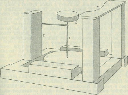 3. Hrnčiarskej kruh. 1. spodnia šajba, 2. vrchnia šajba, 3. vreteno (prv drevenné), 4. sedák, 5. stúp.