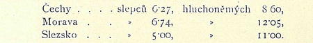 Vedle úmrtnostních poměrů dotýkaly se dvě mapky trvalých chorob: slepoty a hluchoněmoty. I tuto bylo sice provedeno rozvržení jich dle hejtmanství; ale nelze z toho žádný úsudek o vlivu té které krajiny na choroby ty vyvozovati. Neboť jednak ti, kdož jimi trpí, často mění bydliště, jednak mnoho z nich nachází v různých ústavech dobročinných útočiště, čímž se krajině té přitěžuje. — Uvedeme tu proto pouze průměrné číslice, udávající počet na 10.000 obyvatel: