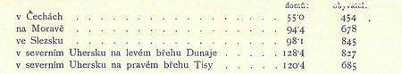 2. Průměrná zalidněnost jednoho domu v zemích koruny české a v severozápadním Uhersku jest velmi rozličná. Tak v Čechách bydlelo průměrně v jednom domě 8,25 osob, na Moravě 7,8, ve Slezsku 8,62, na Slovači v krajinách na levém břehu řeky Dunaje 6,44 a v krajinách na pravém břehu řeky Tisy 5,69. Zemské tyto průměry s výjimkou Slezska, kde českým osadám více by odpovídal průměr moravský, mají při tomto momentu přibližnou platnost i pro krajiny výhradně naším lidem obývané.