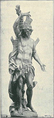 Ačkoli XVII. a XVIII. století vytvořilo u nás spoustu sochařských prací, mezi nimiž mnohé výborné dílo se nalézá, nebylo přece možno ani z této doby důstojný počet vynikajících památek na výstavě soustřediti. Z původních větších soch mělo uměleckou cenu jediné pěkné tělo ukřižovaného Spasitele (ze soukromého majetku) a hlava Kristova pocházející prý s kříže, který na kamenném mostě stával a od Švédů zničen byl. — Umělci, kteří barokní plastiku pražskou přivedli k plnému rozkvětu, zastoupeni byli pouze malými ukázkami, mezi nimiž první místo zaujímal Braunův model skupiny sv. Luitgardy (z majetku JUDra. J. Tomana v Praze). Důležitost ostatních soch kamenného mostu jako výkonu uměleckého nad jiné postaveného řádně vytknuta byla řadou velkých fotografií. Právě tak interesantní jako model sv. Luitgardy, ačkoli v detailním provedení méně dokonalý, byl model morového sloupu na Kladně (majetek kláštera břevnov-ského), který mylně se připisuje někdy Brokoffovi, který však teprve r. 1741 od J. K. Dienzenhofra postaven