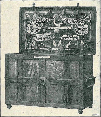 či pokladny celé omalované se složitými, na víku upevněnými zámky, obrovskými o mnoha západkách, jež všecky