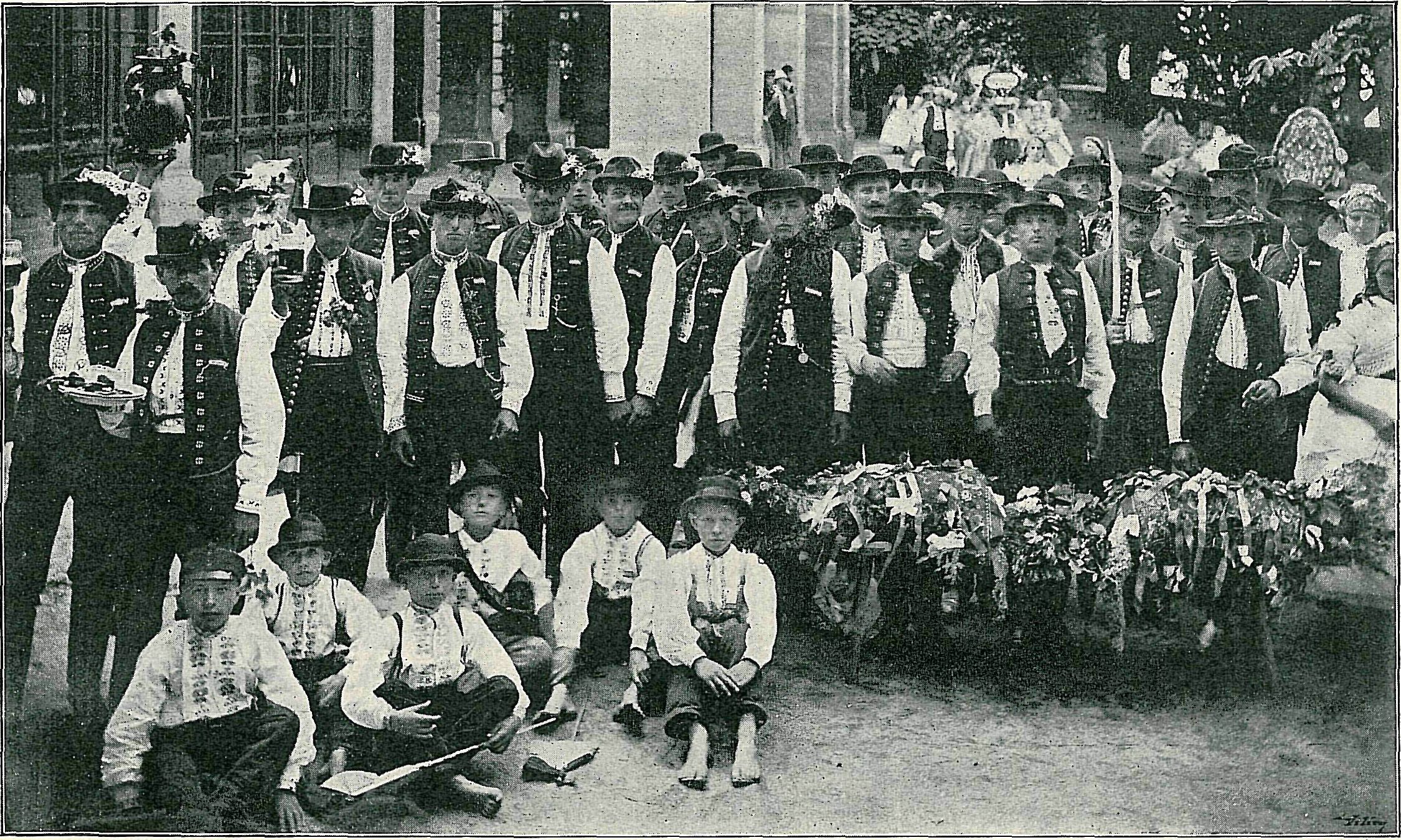 Odpoledne po 4. hod., když výstava se plnila novými a novými zástupy lidstva, projeli svatebčané celým výstavištěm a za zvuků hudby, práskání bičů, volání a zpěvů vjeli do amfiteatru, jehož ohromné prostory byly přeplněny obecenstvem, čítajícím 7—8000 hlav. Pozdraveni nekonečným jásotem objeli svatebčané o pěti vesnických vozech — třech dvouspřežných a dvou čtyrspřežných — velice bystře, ano chvílemi pravým tryskem, celý vnitřní kruh amfiteatru, načež zastavili před volným podiem, na kterém byla úplně zařízená, sednice nevěstina, sednice ženichova a hospoda. Celý průvod poskytoval postavami a kroji svatebčanů, krásnými spřeženími a zvláště živostí, s jakou sobě svatebčané vedli, neobyčejný a radostný pohled.