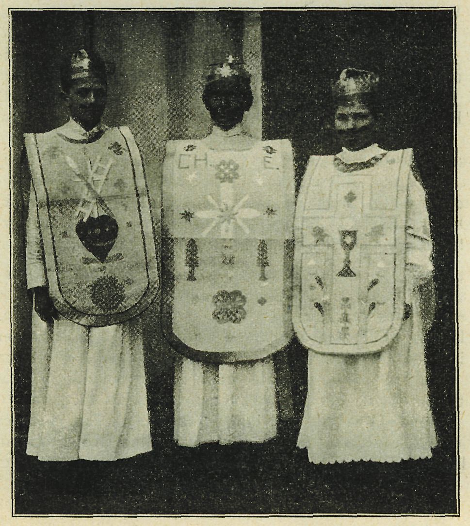 Hoši, vlastně »králi« sestoupnou se tak, aby »mouřenín« stál vzadu za bělochy a bylo mu viděti toliko hlavu. Ukloní se a spustí sborem: 1,. My tři králi ideme k vám, štěstí, zdraví vinšujem vám. 2. Štěstí, zdraví, dlouhá léta, my jsme k vám přišli z daleka. 3. Daleká je cesta naše, až do Betléma cesta naše. 4. Přišli jsme k vám tři králové od východu mudrcové. 5. Jdeme ctíti a chváliti Ježíše Krista do Betléma. Při slovech »Ježíše Krista* všichni se ukloní. Na to dupnou bílí králi a po-