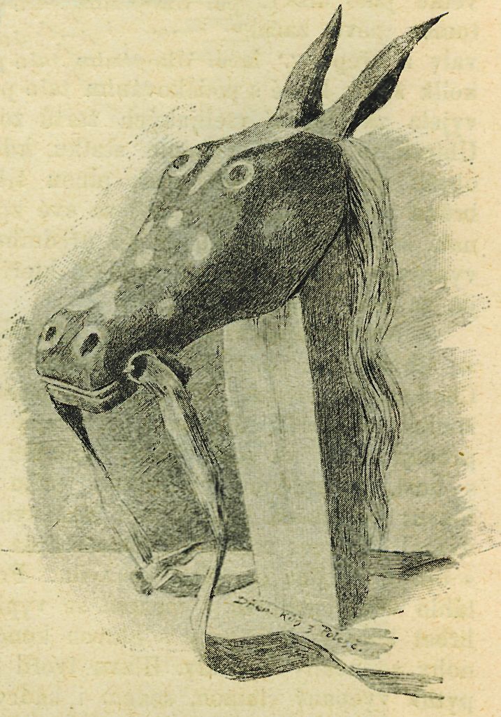 sazené pevně v krku. obkročil jezdec, jako když si děti hrávají, drže v jedné ruce opratě, v druhé dřevěnou šavli. Pomocí tkalounů si přivázal jezdec bidlo k tělu. Za jezdcem prostrčeno bylo bidlo do stanice starého řešata; přehozený plášť na jezdci kryl nazad řešato jako hřbet koně.