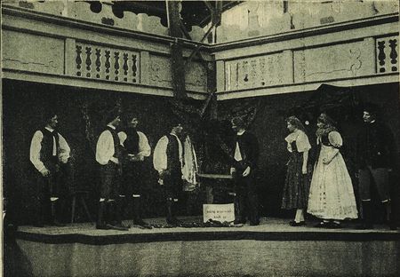 Obr. 52. Ostatkové právo na Hané. PSkupina ve zvykoslovném oddělení Národopisné výstavy 1895