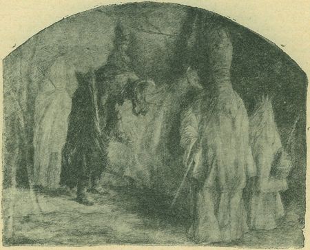 měl oblek hulánský s pikou, druhý trubač, dragounský. Za nimi šli čtyři hajduci v šatě plátěném a pošitém různobarevnými čtverci velikosti dvoj-grošáků s lepenkovými čepicemi homolovitými na hlavách, ostře končícími a zdobenými peřím nebo pentlemi. Celá čepice byla olepena strakatým papírem a střecha byla jako u klobouku zšíří asi 5 cm., ale s třepením, dracounem a korálky. Na úzkém pase koženém visely haj-dukům 3—4 zvonce, a jeden měli též na levé ruce. V pravici drželi karabáč s krátkou násadou. Obličeje zakrývaly pěkné škrabošky. Jim se podobali čtyři třísňáci v plátěných oděvech, požitých různobarevnými třásněmi v délce as 15 cm. s karabáči v rnkou. Po stranách kalhot mezi třásněmi měli upevněné hlušice a na koženém pasu velké zvonce. Čepice