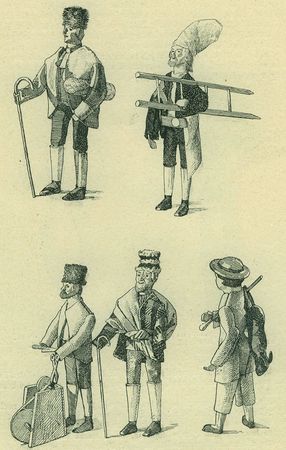 Obr. 57.— 61. Panáci (koledníci) z trhu Mikulášského v Klatovech. Kreslil prof Ferd. Vaněk.