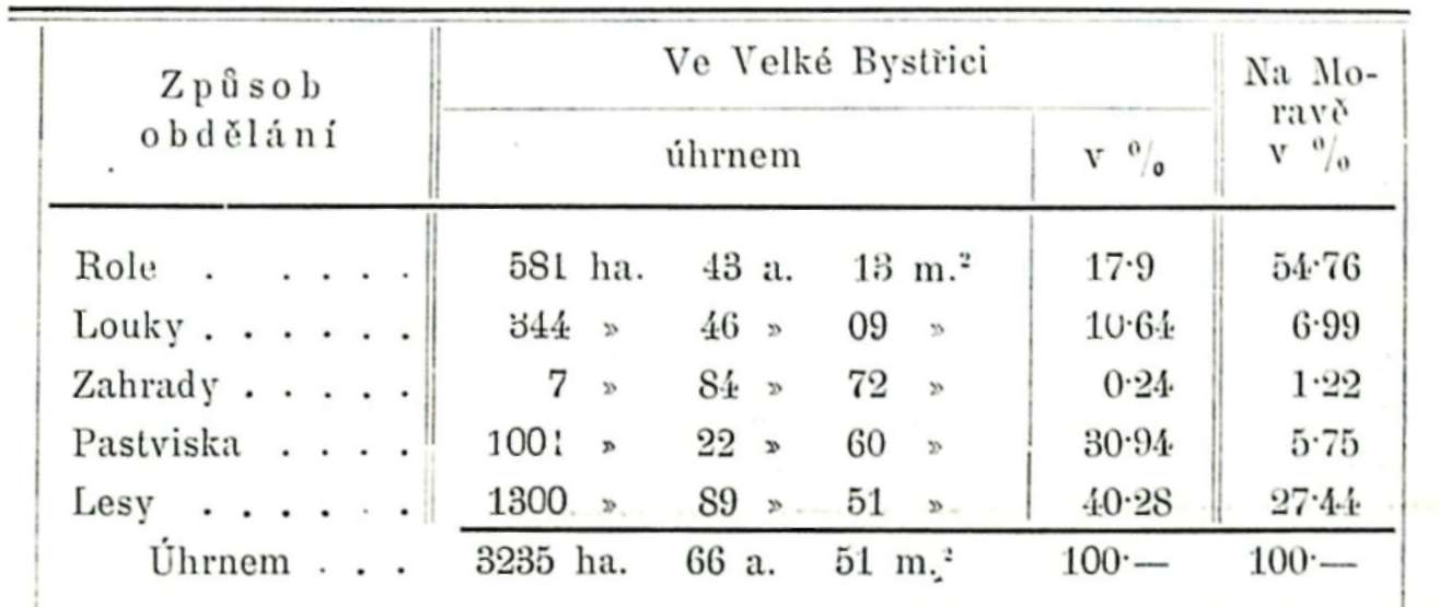 Vidno, že není ani možno veškerou půdu věnovat rolnictví a že loto jesl jakousi poslední pomocí, které se však přes lo nikdo nevzdává pro případ, že by jinak nebylo lze se vyživili. A skutečně, všimneme-li si rozdělení půdy co do způsobu jejího využitkování, shledáme, že role činí tu jen nepatrné procento celku. Z následující tabulky vysvítá, jak daleko je v tom ku př. za Moravou jako celkem. Vzdělavatelné půdy je 32 km2 36 ha.