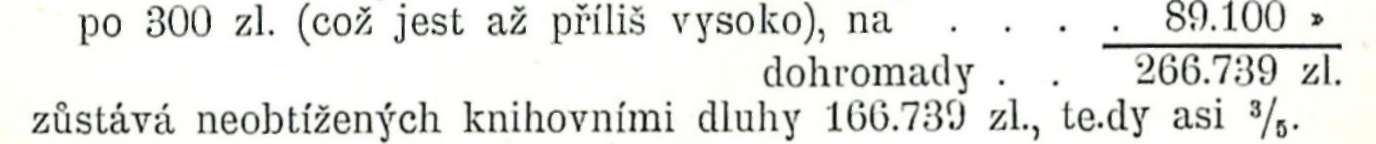 Nynější stav zadlužení knihovního dosahuje polovice skutečné ceny. To dělá především zadlužení velkostatku, který z finančních krisí nevychází. Ale i ostatní usedlosti jsou značně stíženy. Činí totiž knihovní zadlužení okrouhle asi 100.000 zl. Necháme-li dříve
