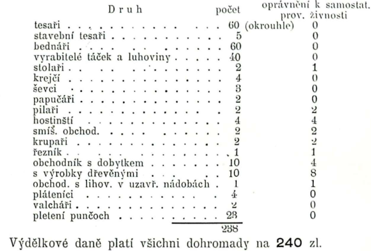 V 15 případech jsou tato zaměstnání jediným zdrojem výživy celé domácnosti. U jiných příjmy doplňují se výtěžky polního hospodářství, jinde prací žen a dětí, jinde jiným vedlejším zaměstnáním. Jako dělníci za mzdu pracuji, jak řečeno, tesaři (l>5) a pak pomocníci při pile, při podomním obchodě a při jiných živnostech (ač jsou-li jací, obyčejně naučí otec syna svému umění a tu ovšem není námezdního poměru), ostatní vystupují jako samostatní živnostníci. Živnostenský list k tomu má pouze 11 (asi 10%. Ostatní provozují živnost jako domácí průmysl nekoncesovaně a nezdaněné).