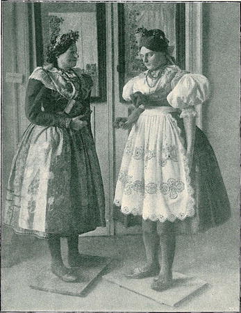Nevěsta koza c k á. Vypadá skoro ponuře, proto že jest v kabátci. Ale nemohlo býti jinak. Vždyť bývaly svatby o masopustě v zimě a do kostela bylo někdy dost daleko. Sukni i fěrtoch, má z těžkého květovaného brokátu. Poněvadž pak brokát byl velmi drahý, vloženo do předu vždycky jedno pole kartounové „lecos" zvané, kteréž ovšem fěrtoch pak úplně zakryl.