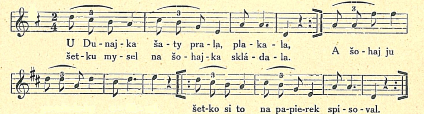 Názvuky intervallů nezapírají též jistých potíží. Zapisovatel kolísal v notaci*); proto i připojil dotyčnou poznámku. Nebo snad píseň kdosi špatně zpíval?