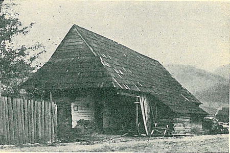 Obr. 17. Stodola za vsí, spojená s chlévy a podsíní v Gombáši u Ružomberku.