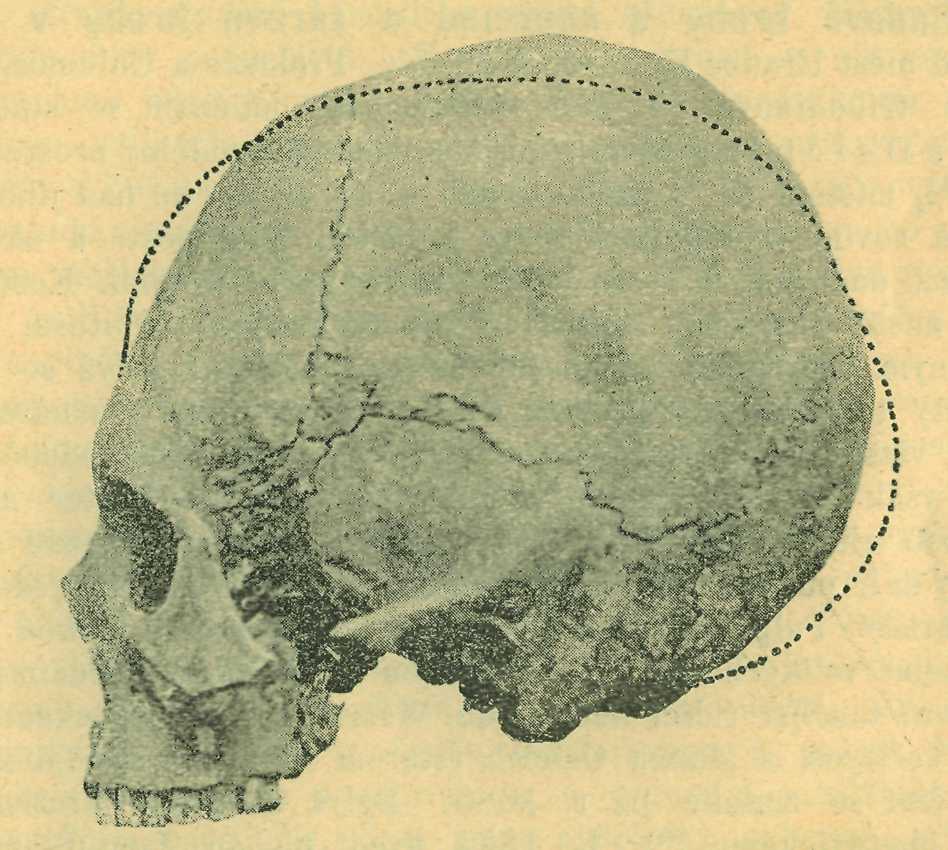 Jest to prvý doklad umělé deformace lebečné z hrobů předhistorických v Čechách, a pokud víme 8. určitý***) doklad že zemí rakousko-uher-ských (z nich 4 z Uher z Csongrádu, z Ö-szöny a z Panczovy z doby pozdní, z Lengyelu z doby bronzové). Mimo Rakousko přicházejí lebky podobné častěji jen v jižním Rusku (na Donu, na Krimu)