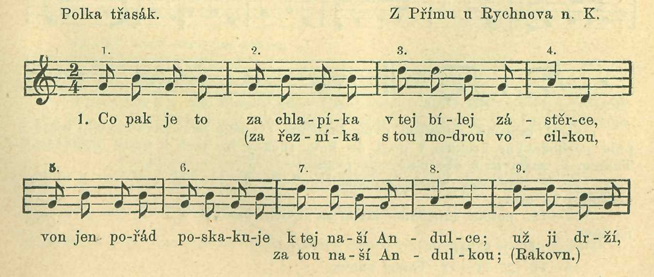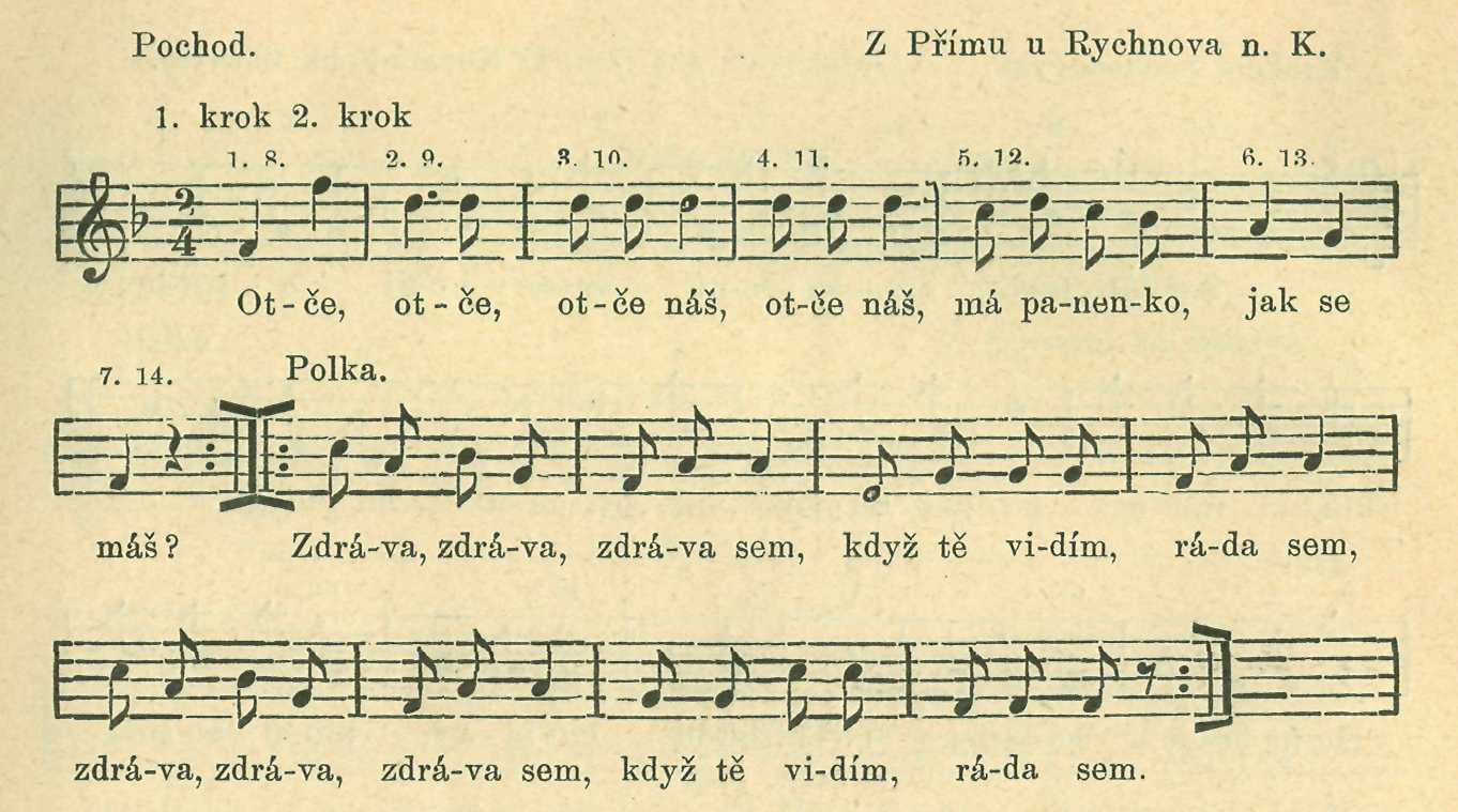 1 – 7. 8 – 14. (Obyčejně 8 párů do kola). Tanečník drže tanečnici za pravici vedle sebe, jakmile hudba začne, pustí ji před sebou do vnitř kola, kde ona. čilým pochodovým krokem postupuje směrem z leva na pravo, kdežto tanečník směrem svým přímo, z prava na levo, týmže krokem do kola jde proti ní. Což činí páry všechny. Když se tanečníci se svými tanečnicemi sejdou, vezmouce se po selsku tančí polku, až se zase tanec opakuje znova. (Taky mohou tanečníci jíti do kola a tanečnice postupovati z prava na levo).
