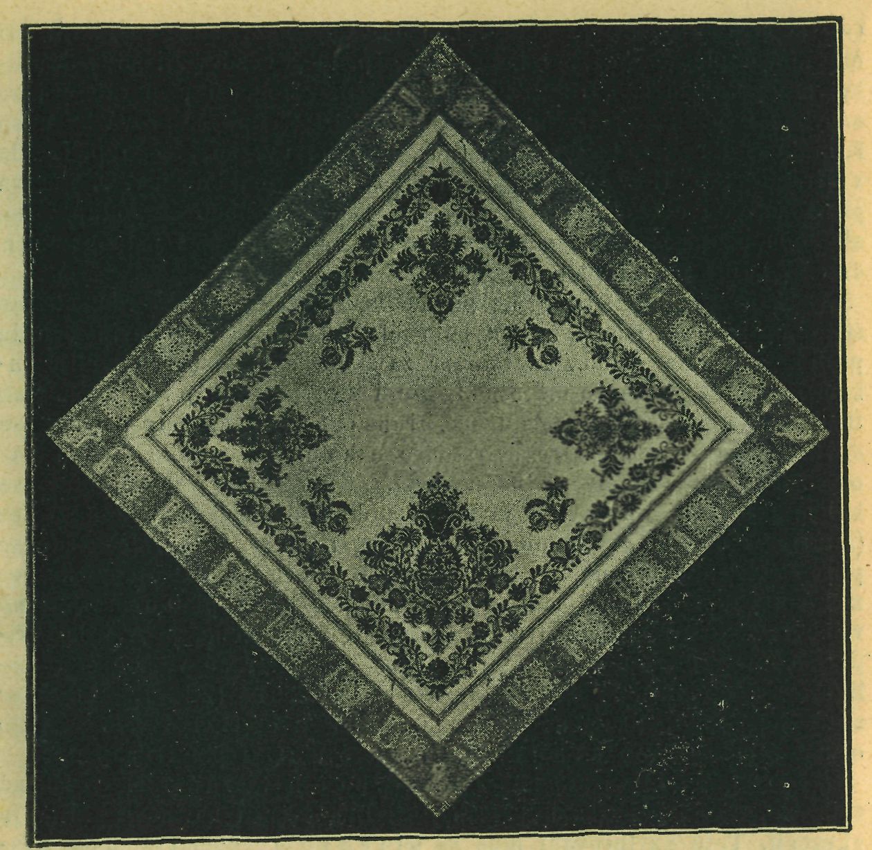 Prostírka s krajkou, dle plachetky z Polabí, provedená v Městské pokračovací škole v Praze.