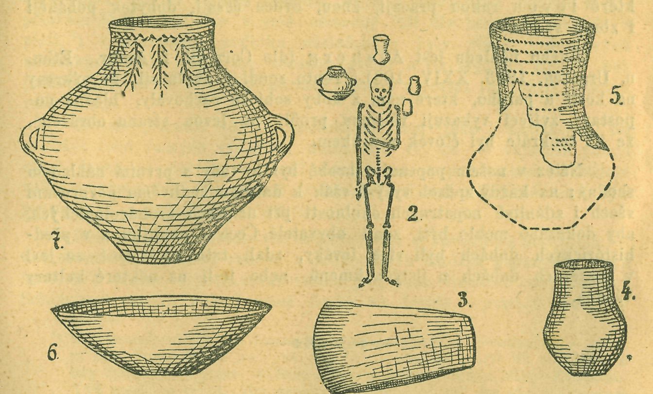 Hrob první byl, jak podotknuto, p. Fr. Hanamannem vlastnoručně prozkoumán, i nemám žádné pochyby o jeho správném složení. Dle polohy levé ruky a mlatu lze se domnívati, že mrtvola držela topůrko, na kierém byl připevněn mlat, v levé ruce. Z toho bychom mohli dále souditi, že mlat vůbec u té osoby byl levou rukou veden ; jednalo by se tedy o užívání levé ruky jako naší pravé.