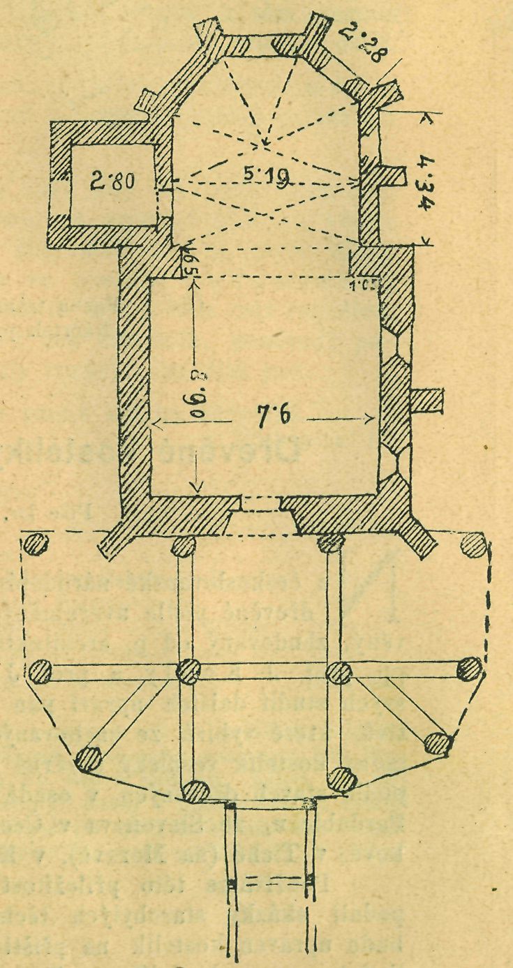 západním průčelí prostrannou předsíň. K zvonici vede přes příkop dřevěný krytý most. Kolem kostela je hřbitov, oUrazený prostým plotem. Zajímavá je zvonice ostře zakončená a dokladně sroubená z dubových trámů, kteréž jsou postaveny kosmo proti sobě a dosahují až po krov a rovněž jako střecha kostelní zvenčí až k zemi dolů šindelem jsou pobity. Pro jasnější názor, jak je střecha na okraji sroubená a jak vypadá úprava mostu dřevěného, podáváme náčrtky, které ve své mapě choval p. prof. J. Koula (viz obr. čís. 1. a 2.). Připojený půdorys (obraz číslo 3.)