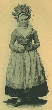 Ještě více blíží se středověkému pentlení úprava hlavy nevěsty z Boleslavská, jak byla obvyklou na počátku -tohoto století a jejíž dva velice instruktivné obrázky připojujeme. Na obou viděti, že koruna upevněna na holubince, že v zádi hlavy ukryty jsou vlasy úplně kvítím, a že na záda splývají delší pentle alespoň dvě. Velmi pěkné pentleni nevěsty ukázalo světu museum jindřichohradecké