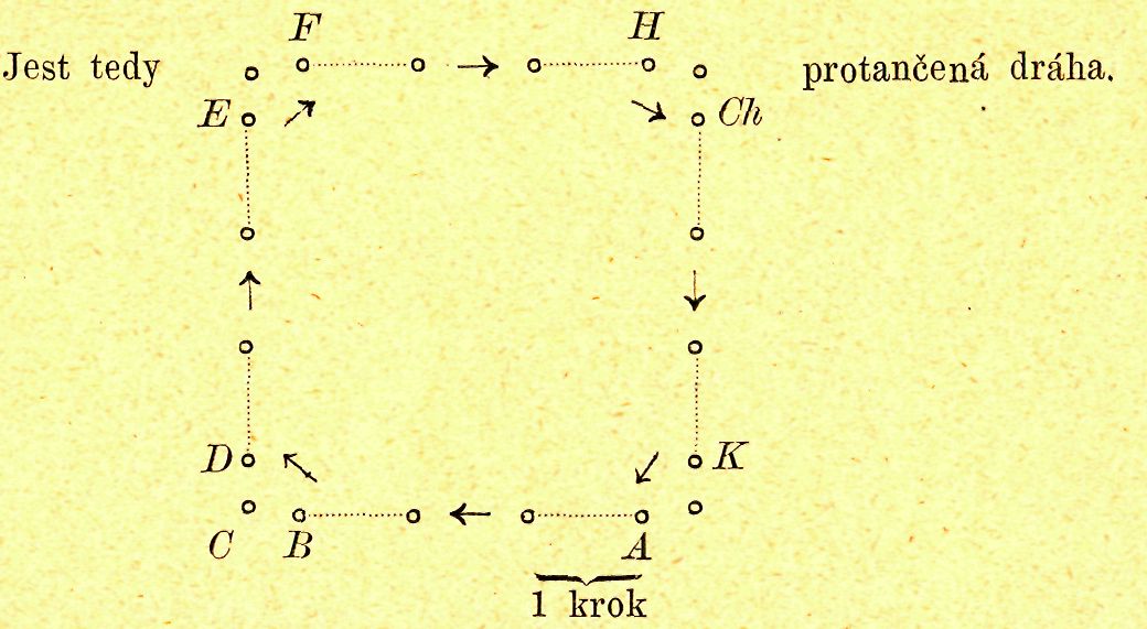Tanečník s tanečnicí tančí, jednoduše se držíce, z původního místa (A) v (1.—2. a) takte tři drobné úkroky v levo s přísuny (do B). Při (2. b) ukročí tanečník z nového stanoviště (B) v levo dále (do C) a stanuv na levé noze, obrací se na ní čtvrtobratem a přenáší pravou nohu do nového místa (D), takže z dřívějšího směru se posunul v pravém úhlu. Pravou nohou (3.—4. a) ukročí:a k zemi dopadne, a postupuje třemi přísunovými drobnými kroky v právo (do E). (4. b) Při druhé čtvrti taktu, spočívaje na pravé noze, se otočí v pravém úhlu v levo v bok a levou nohu přenese v oblouku (do F). (5.—6. a) Ukročiv levou nohou a k zemi dopadnuv, postupuje třemi úkroky v levo (do H). (6. b) "Na levé noze se postaví. Přenášeje pravou nohu, otočí se v pravém úhlu čtvrtobratem v levo v bok a (7.-8. a) pravou nohou ukročiv a k zemi dopadnuv (v Ch), postupuje třemi kroky přísunovými v právo. (8. b) Pravou nohou ukročí (K), pak, přenášeje levou nohu, se současně otáčí. Levou nohou ukročí čtvrtobratem, otofie se o úhel pravý (do A) a tančí tanec znova. Tanečnice koná všechny tyto obraty opačnou nohou v opačnou stranu.