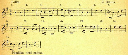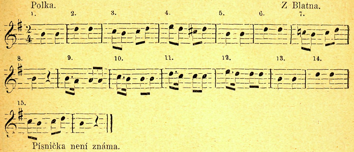 (I.—4.) Páry tančí, držíce se jako obyčejně, polku do kola, načež (5.) třikrát dupnou. Tanečník dupne levou nohou, pak pravou a zase levou. Tanečnice dupne pravou nohou, pak levou a zase pravou. (0.) Tanečník dupne pravou nohou, pak levou a zase pravou, a tanečnice dupne levou nohou, pak pravou a zase levou nohou. (7.—10.) - (1.—4.), (11.—12.) = (5.-6.) Tanec znova,
