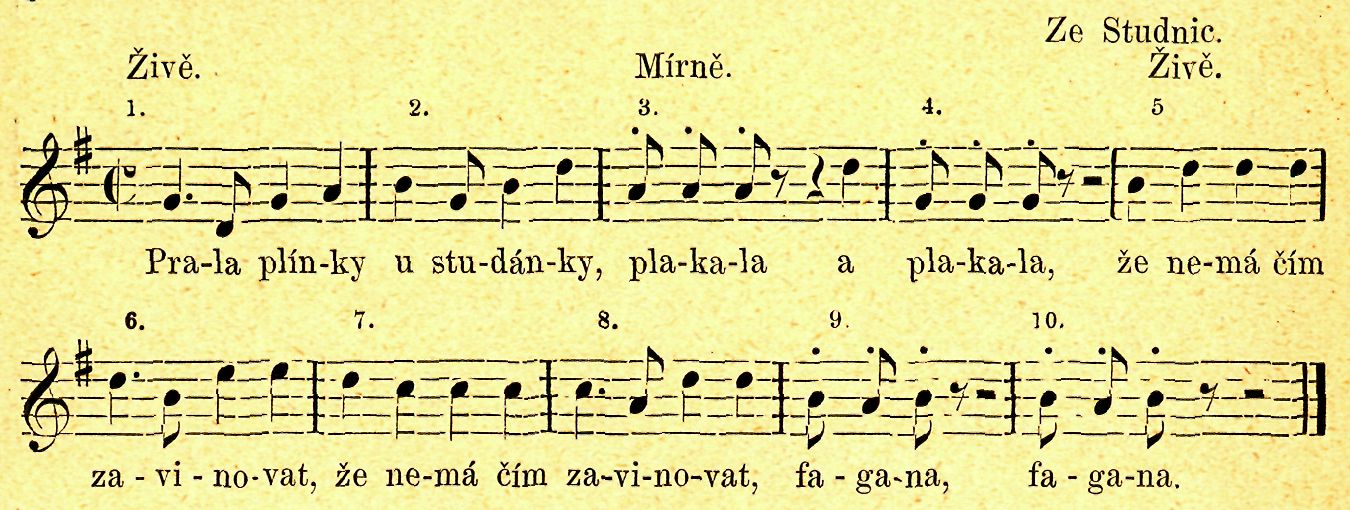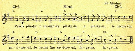 Prala plýnky u studýnky plakala, [: ach, kýž sem tě byla raděj neznala,:] Proč pak si tak, má panenko, stěžuješ, [: dyž už vidíš, že má bejti nemůžeš, nemůžeš. :]