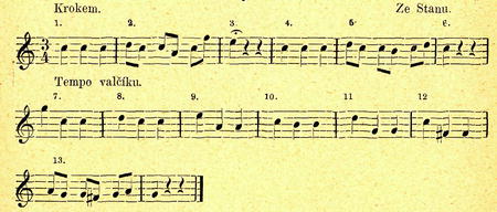 Tancují (ve Studnicích) v taktech (1.—2.) polku, v taktech (8.-4.» trojnásobně podupnou, a zase v taktech (5.—8.) polku, pak (9.—10.) jako ve 3.—4. taktu. Polka znova.