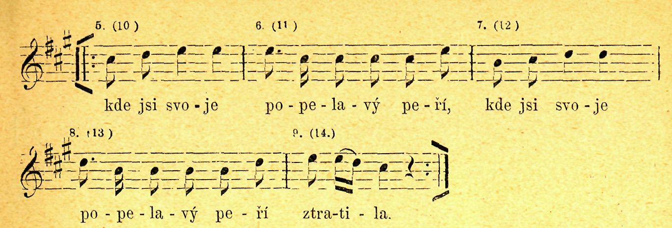 Tanečník postaví se (čelně) na levou stranu své tanečnice a vezme se s ní v zadu za ruce křížem. Při takte (la.) vykročí levýma nohama v před a dopadnou, pravé nohy v zadu pozvednou, v další čtvrti taktu (1. b) pozvednou levé nohy a pravýma nohama dopadnou. (1. c) Přejdou levou nohou v zad, pravou v před, a pak v taktu (2. a) dopadnou pravýma nohama, levé v zadu pozvednou, a pak (2. b) pozvednou pravé nohy a levýma dopadnou. V pomlčce (2. c) přejdou pravou nohou v zad, levou v před a (3. a) dopadnou levýma nohama a tančí dále vždy stejně po dvou taktech, takže (3.-4.) jako (l.—á.), (0.—6.) jako (1.—2.), (7.-8.) jako (1.—2.). (9) Otočí se při slově „ztratila" a tančí od repetice čelem v opačnou stranu, při (14.) opět se otočí při slově „ztratila".